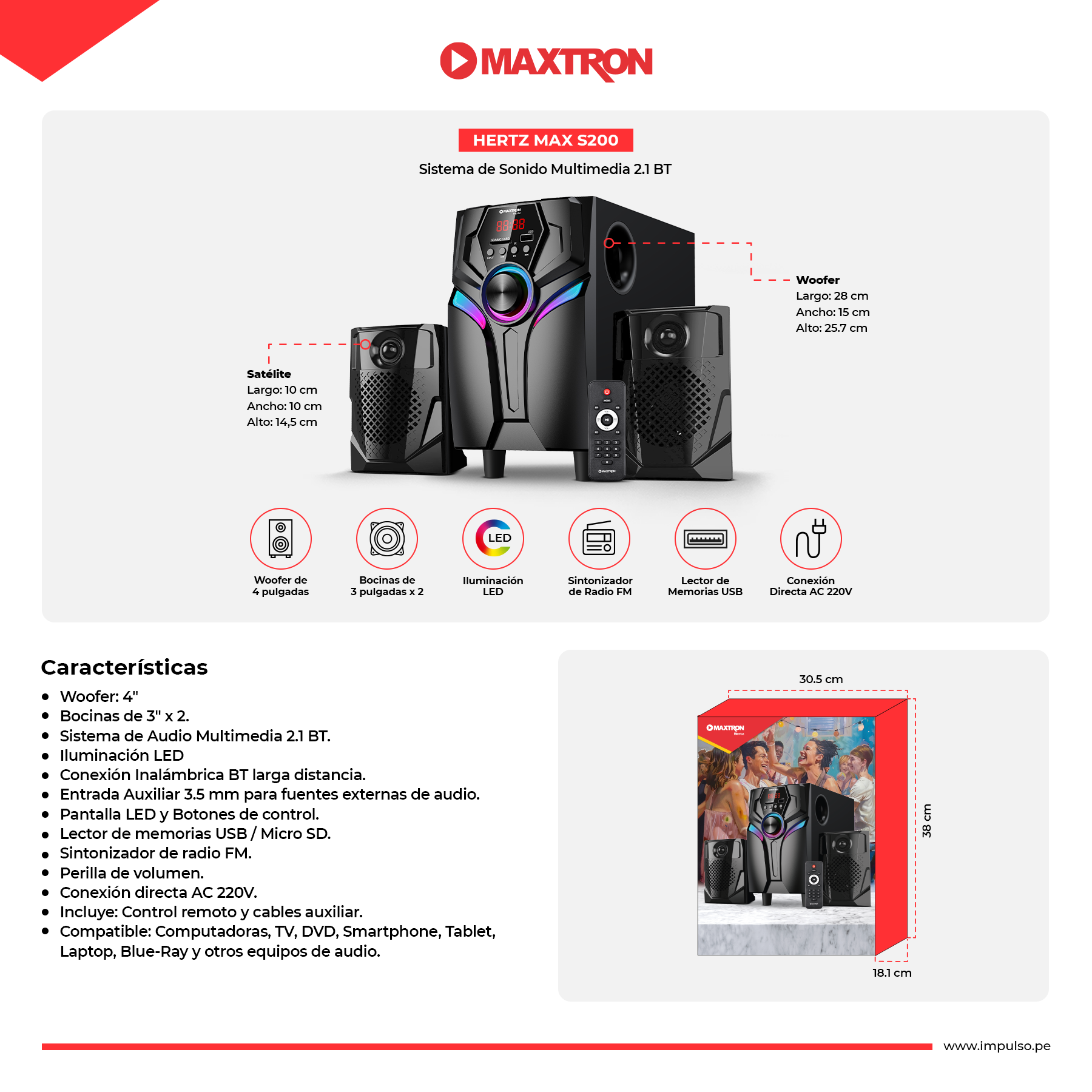 Incluye: Control Remoto y Cables Auxiliar.