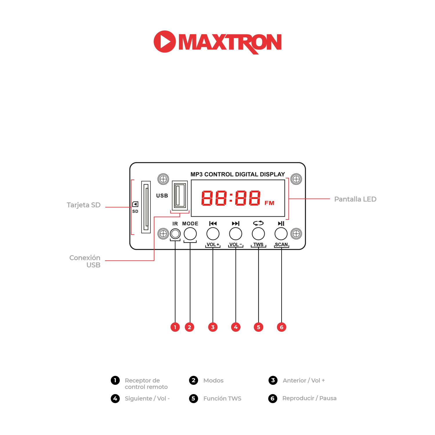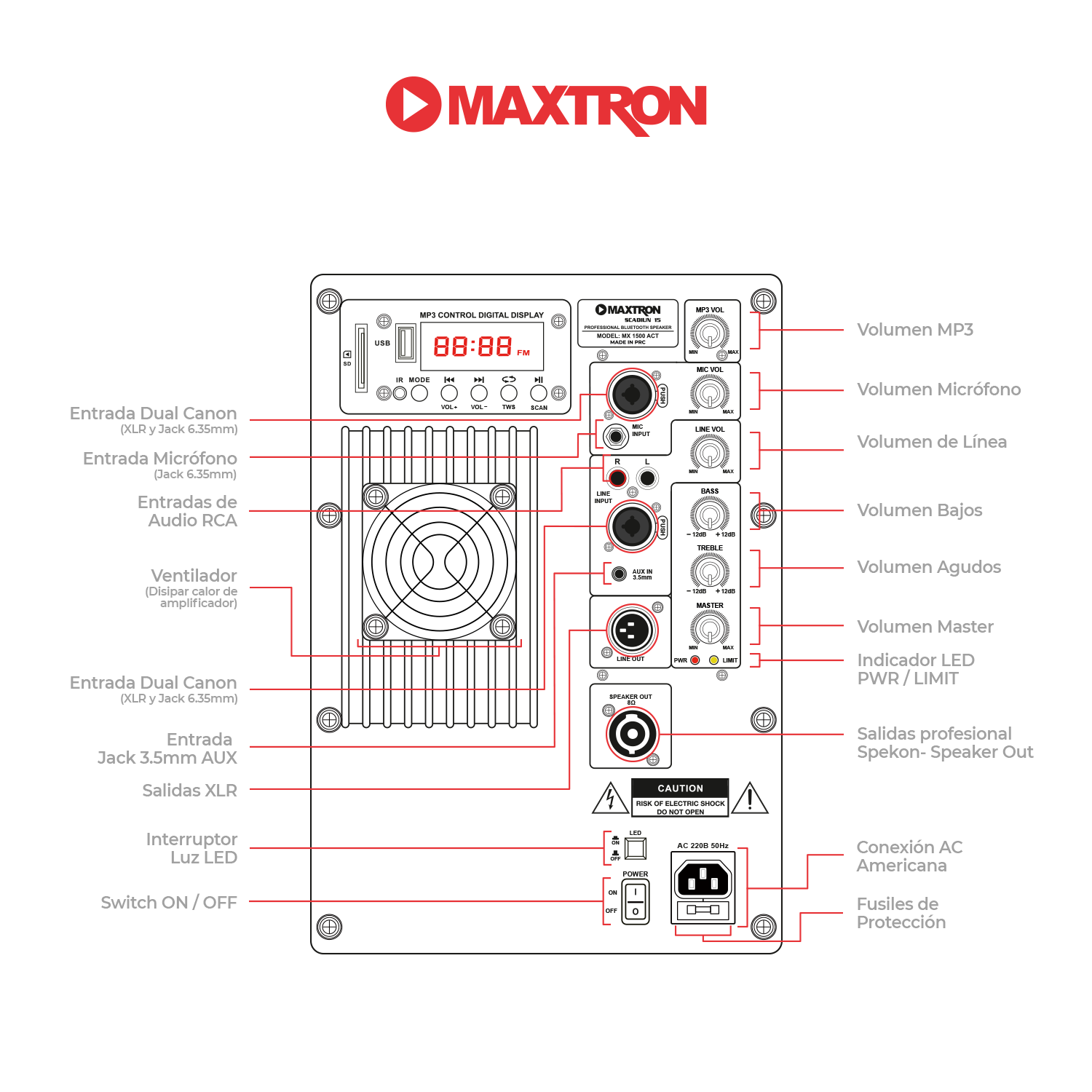 Perillas: Control de Volumen Máster, Volumen MP3, Volumen de Micrófono, Bajos y Agudos, Volumen en Línea. |