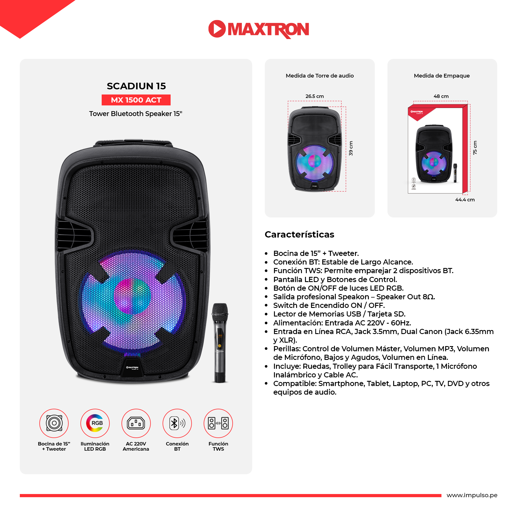 Incluye: Ruedas, Trolley para Fácil Transporte, 1 Micrófono Inalámbrico y Cable AC. |