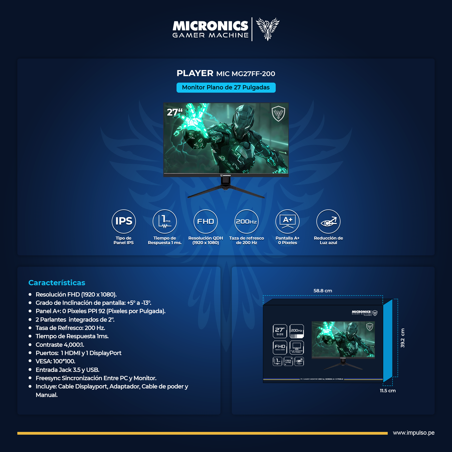 Incluye: Cable Displayport, Adaptador, Cable de poder y Manual