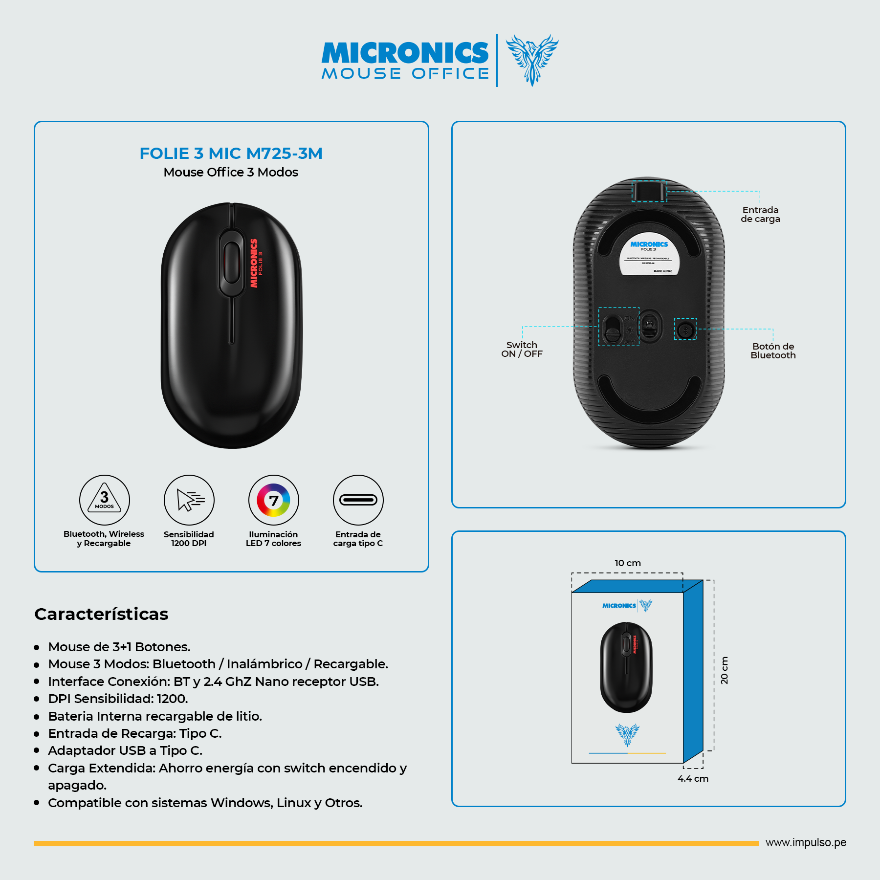 Mouse 3 Modos: Bluetooth / Inalámbrico / Recargable.